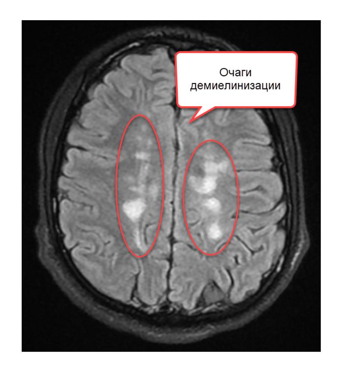 Магнитно-резонансная томография является полезным методом обнаружения измененных участков в передних долях мозга и возможности выявления глиоза, который расположен в области желудочков головного мозга. Небольшие очаги диаметром от 3 мм в пространстве над наднадценториальной областью легко видны на МРТ снимках.
